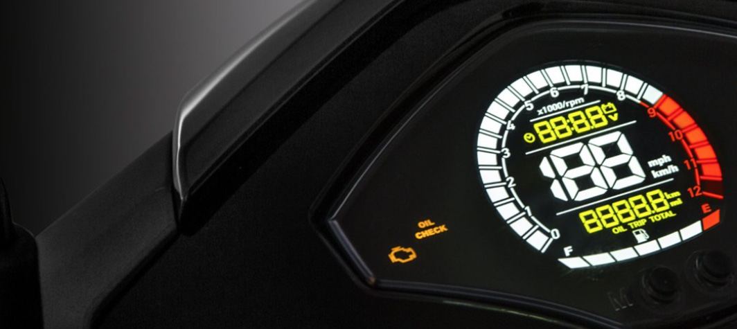 Le tableau de bord s’enrichit d’un écran numérique affichant une horloge, un compte-tours, tension de batterie et un totaliseur journalier.