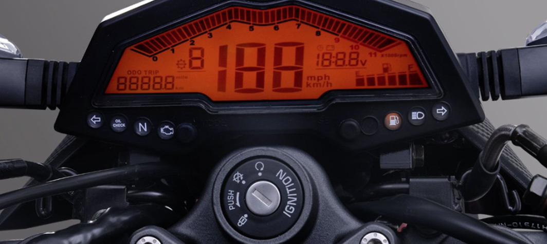Le tableau de bord LCD multi-fonctions se compose d’un compteur de vitesse, compte-tours, voltmètre, témoin de rapport engagé, jauge à essence, des témoins de contrôle usuels et d’une prise USB.